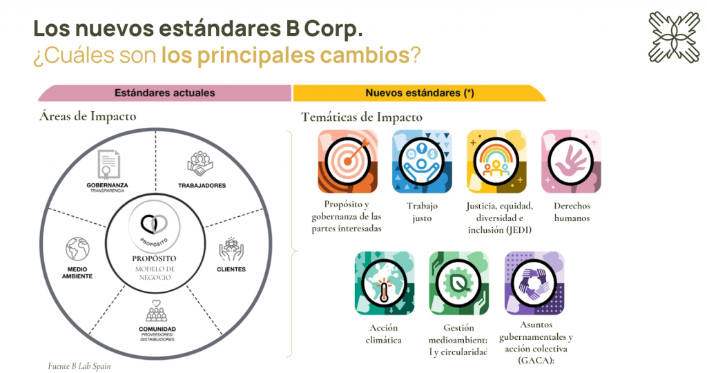 La gran novedad es el paso de evaluar a las empresas principalmente por grupos de interés (trabajadores, clientes, comunidad, medio ambiente, gobernanza) a hacerlo por áreas de impacto clave para la sostenibilidad y la justicia social.